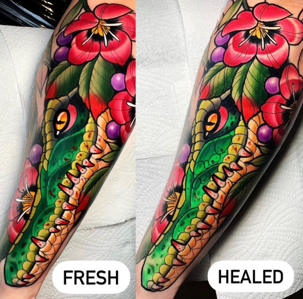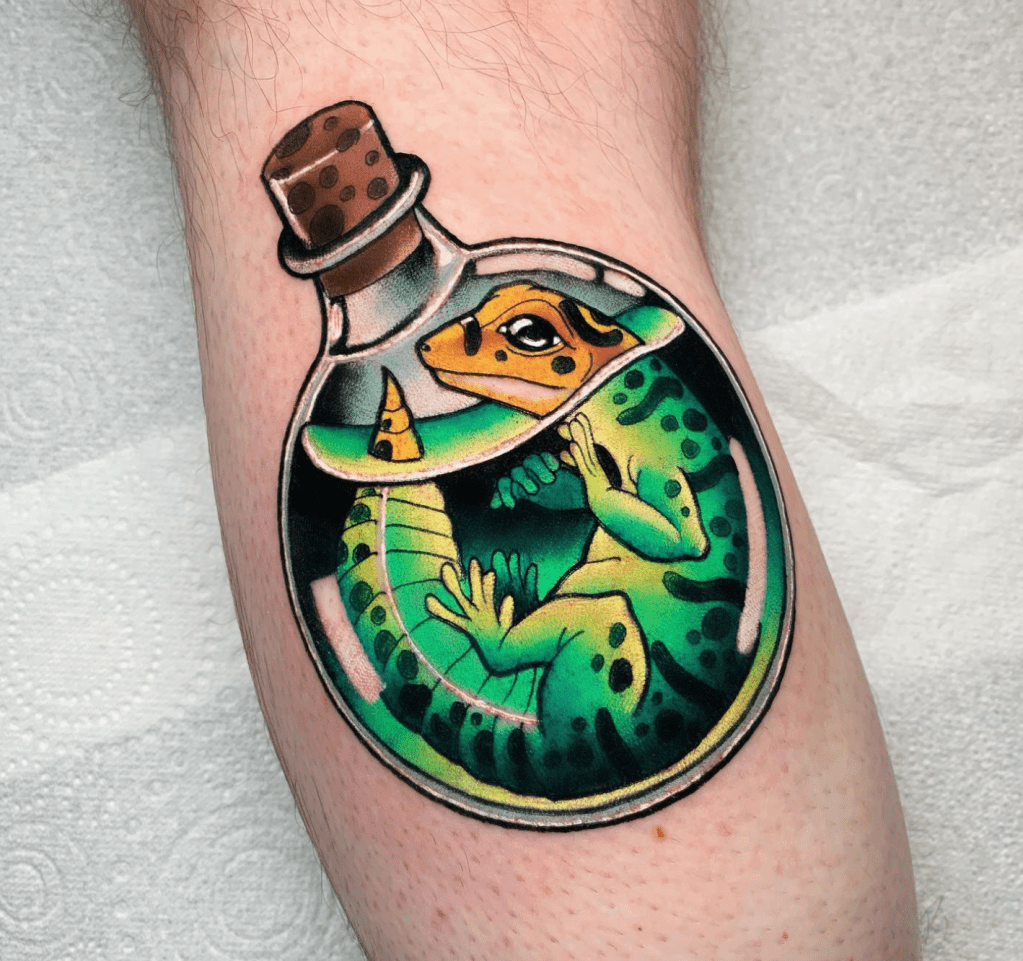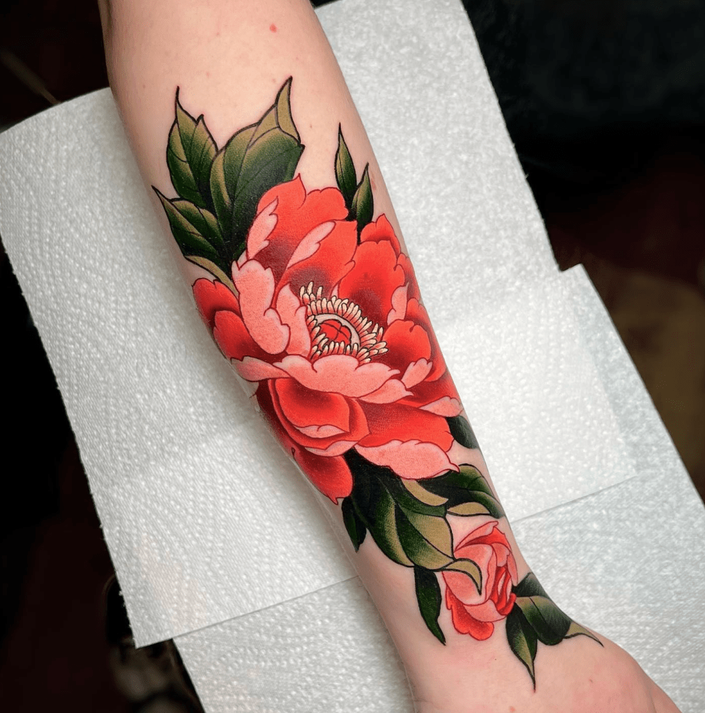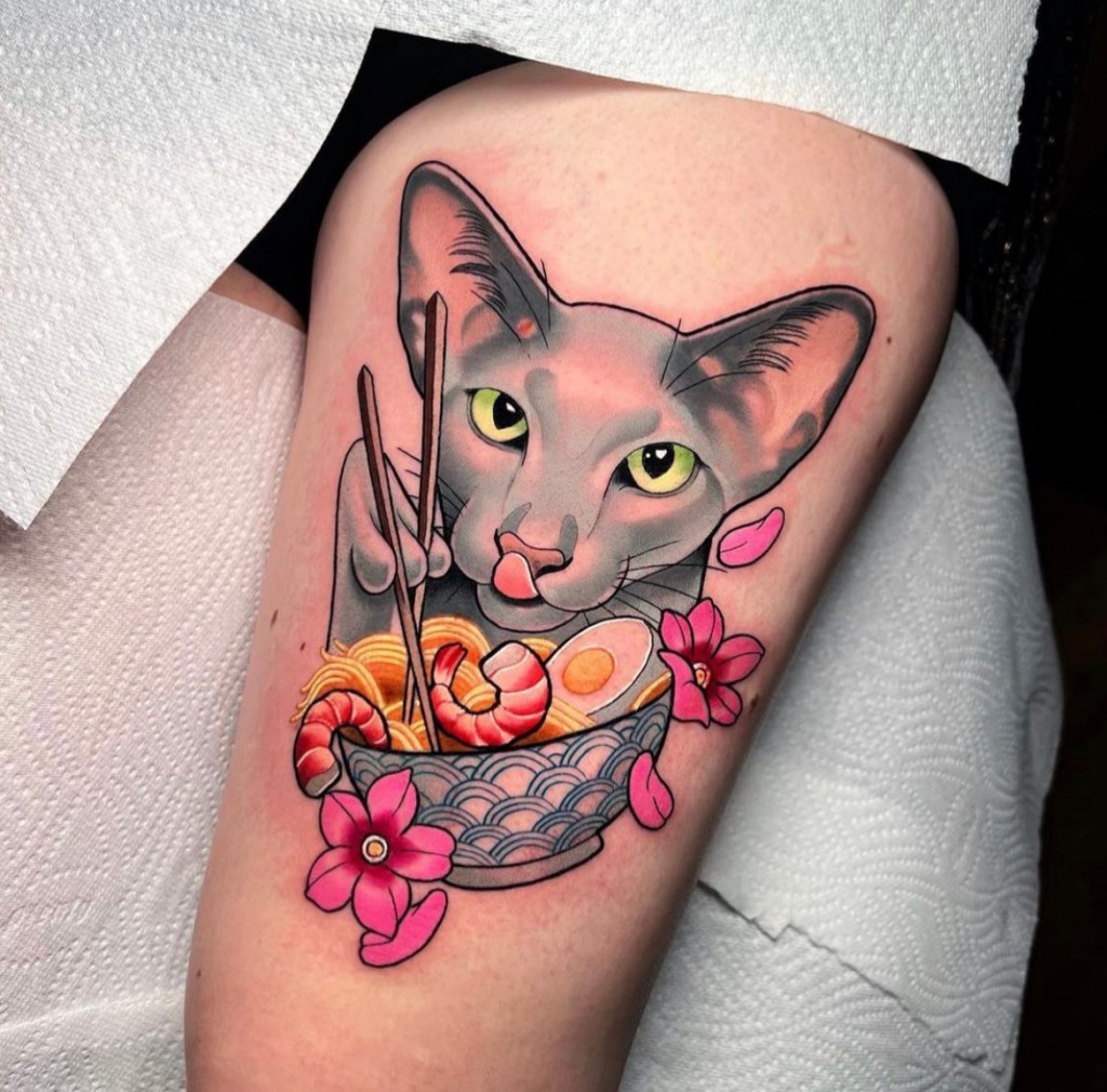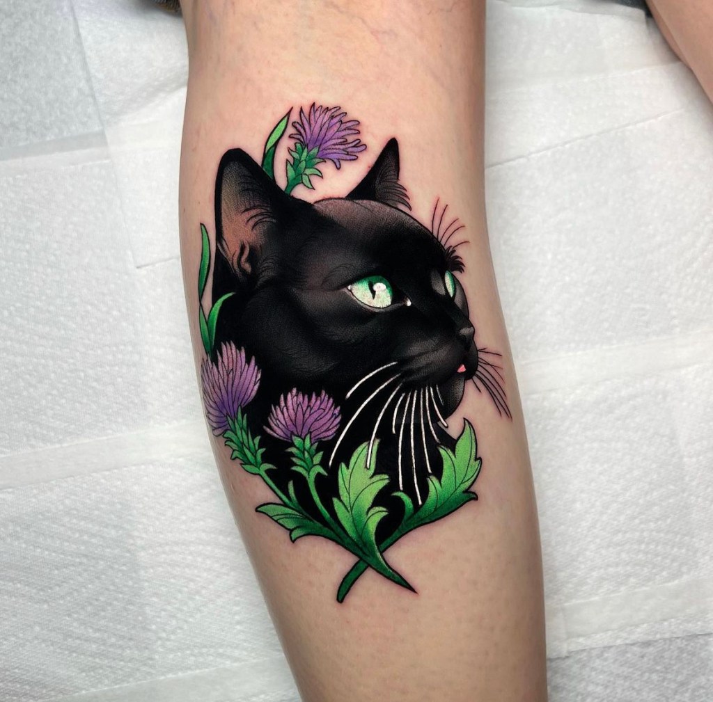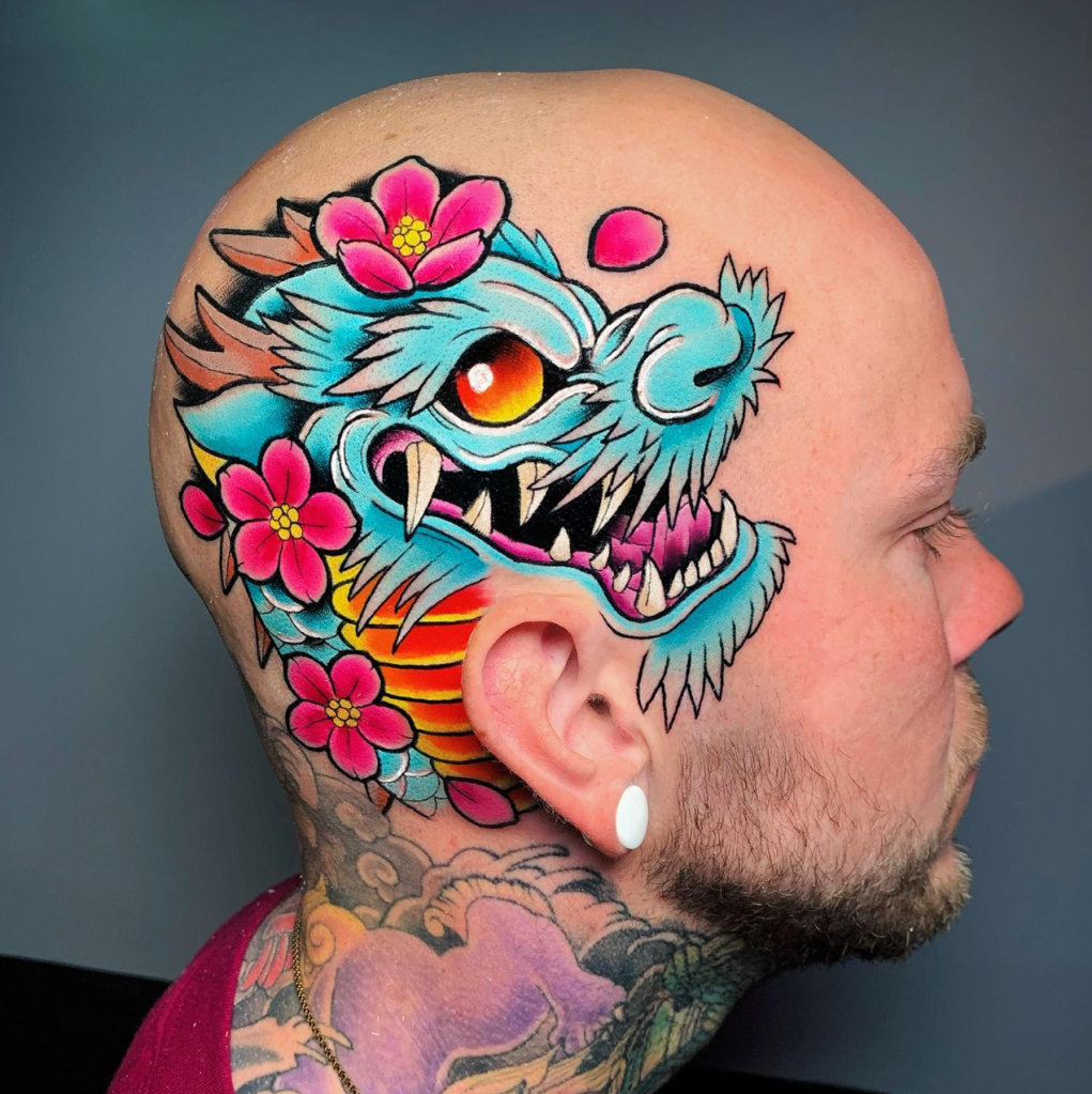 Chris specialises in vibrant neotraditional and illustrative tattoos, varying from bold concepts to softer palettes with ornamental details included. Well known for his pet portraits and Pokémon, Chris loves taking on a range of subjects from botanicals and animals, to elvish daggers, to pink and gold maces!